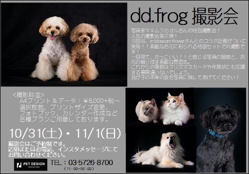 dd.frog写真撮影会のお知らせ 自由が丘店 2020年10月07日 ツイート 【dd.frog×in blossom flowerコラボ撮影会開催決定!】 開催日:10/31(土)、11/1(日)両日ともに朝11:00~夕方18:00まで。 店内特設ブースでのプライベート撮影。 30分区切りでのご予約優先制となっております。(当日空き時間があればご案内可能) ご予約受付開始しています。 皆様のご予約お待ちしております。 (ご予約は店頭、お電話にて受け付けております。) 一覧へ戻る
