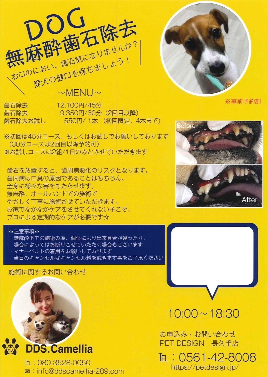 無麻酔歯石除去イベント☆長久手店 2023年10月04日 ツイート *イベントのお知らせ* 「DOG 無麻酔歯石除去」開催いたします☆ 2023年11月12日(日)10:00~18:30 コース内容は下記の写真の通りです。 *必ず注意事項をお読みください ご予約・お問い合わせは、店頭またはお電話にて受け付けております! ご予約の際はご希望のコース内容をお伝えください PETDESIGN長久手店 愛知県長久手市市が洞1-101 TEL 0561-42-8008 一覧へ戻る