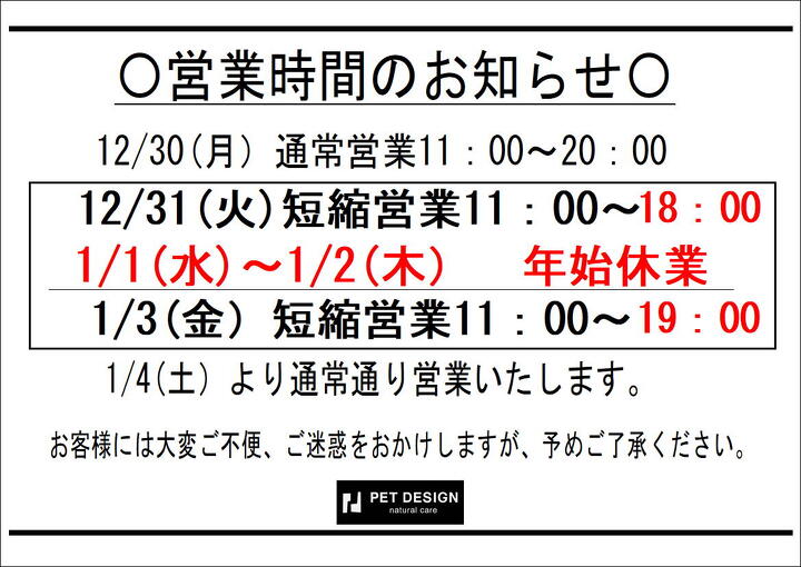年末年始営業時間変更のお知らせ 自由が丘店 2024年12月30日 ツイート 平素より、PETDESIGN自由が丘店をご利用いただき誠にありがとうございます。 誠に勝手ながら、年末年始の休業及び営業時間を一部変更させていただいております。 大変ご迷惑をお掛けしますが何卒ご了承くださいますようお願い申し上げます。 一覧へ戻る