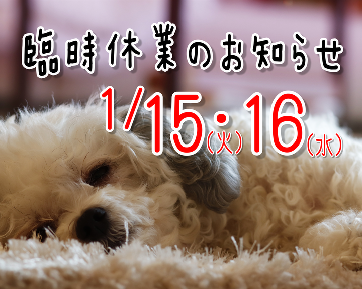 全店 臨時休業のお知らせ 2019年01月08日 ツイート いつもPET DESIGN各店をご利用いただき誠にありがとうございます。 誠に勝手ながら、社内研修のため1月15日・16日の2日間、全店臨時休業いたします。 お客様にはご迷惑ならびにご不便をお掛けいたしますが、 何卒ご了承くださいますようお願い致します。 一覧へ戻る