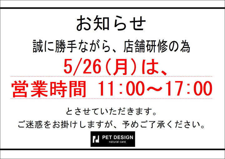 5/26(月) 営業時間のお知らせ 自由が丘店 2025年05月12日 ツイート いつもPETDESIGN自由が丘店をご利用いただきましてありがとうございます。 店舗研修のため下記日程の営業時間を変更させていただきます。 【日程】 2025年5月26日(月) OPEN 11:00 ~ CLOSE 17:00 一覧へ戻る