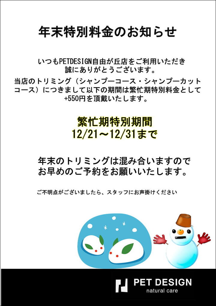 トリミング年末料金のお知らせ ☆自由が丘店 2024年09月20日 ツイート いつもPETDESIGN自由が丘店をご利用いただきましてありがとうございます。 当店のトリミングにつきまして、12/21~12/31の期間は年末特別料金といたしまして+550円を頂戴いたします。 ご迷惑をおかけしますがご理解のほどよろしくお願いいたします。 一覧へ戻る