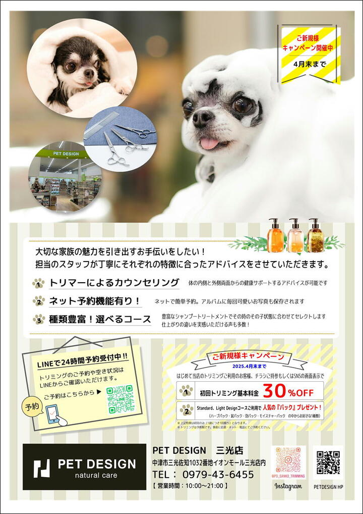 3月トリミング ご新規様キャンペーン実施中!! PETDESIGN三光店 2025年03月07日 ツイート 3月ご新規様向けのキャンペーン実施中!! チラシご持参、またはSNSの画面表示で 初回トリミング基本料金30%OFF!! 大人気のパックをプレゼント!! キャンペーンは4月末までです! この機会にぜひ、PETDESIGNのトリミングを体験してみませんか?? 皆様のお越しを心よりお待ちしております。 一覧へ戻る